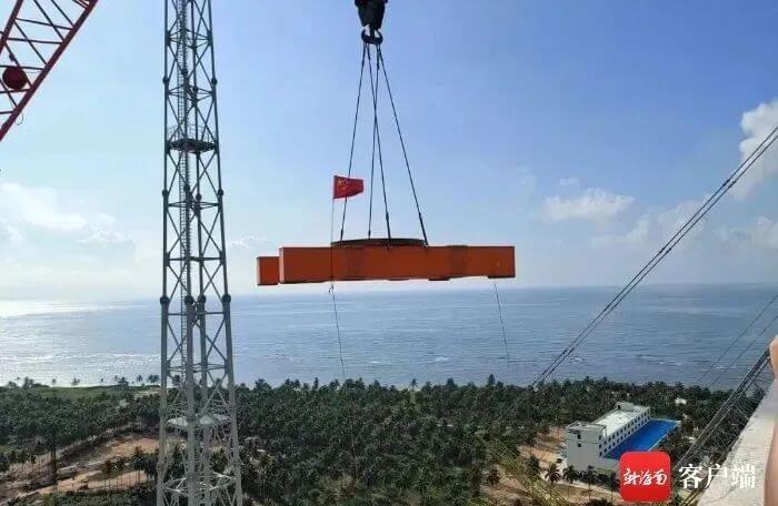 It is understood that the base of the tower crane at the top of the fixed service tower is 9.4 meters long, 6.4 meters wide, and weighs 49 tons. Due to its large weight, length, and width, the lifting difficulty is high, especially with its large horizontal area, making it difficult to maintain balance in windy weather. It requires close cooperation between ground workers, workers at the top of the service tower, and crane operators. Subsequently, equipment such as the boom, slewing ring, and locking device will be installed gradually.